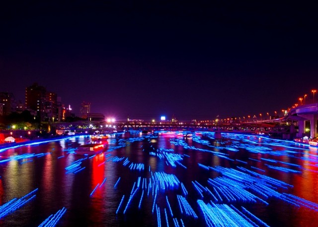 Increíble miren como se ve ese río invadiso por miles de luces led, y como con una fotografía de larga exposición se logro esa imagen que tiñe el rió de azul.