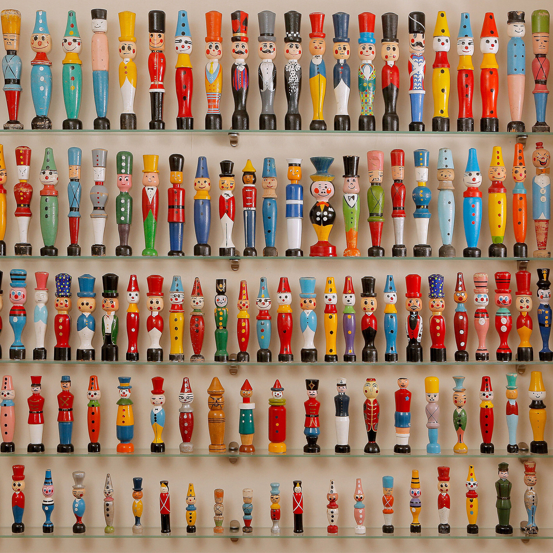 Palitroques, chilenos y de madera torneada. Algunos de comienzos del siglo XX, otros más nuevos; pintados de payaso, soldado, caballero, marinero, maestro de ceremonias o mimo conforman esta colorida colección