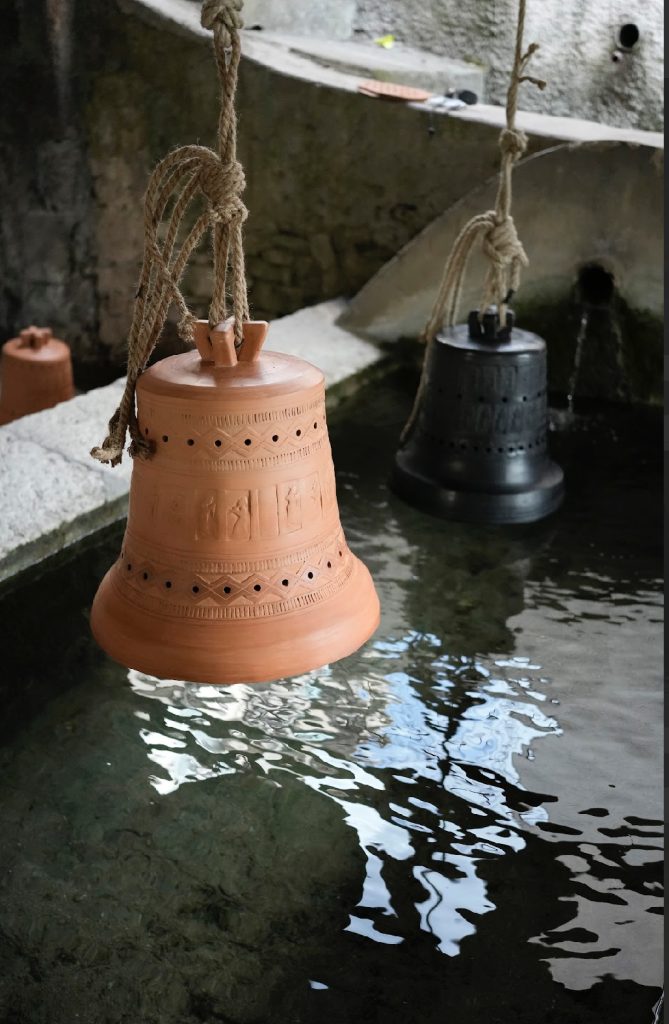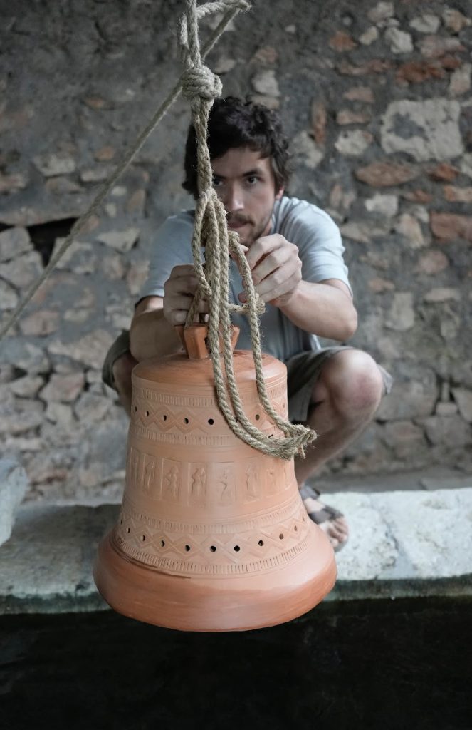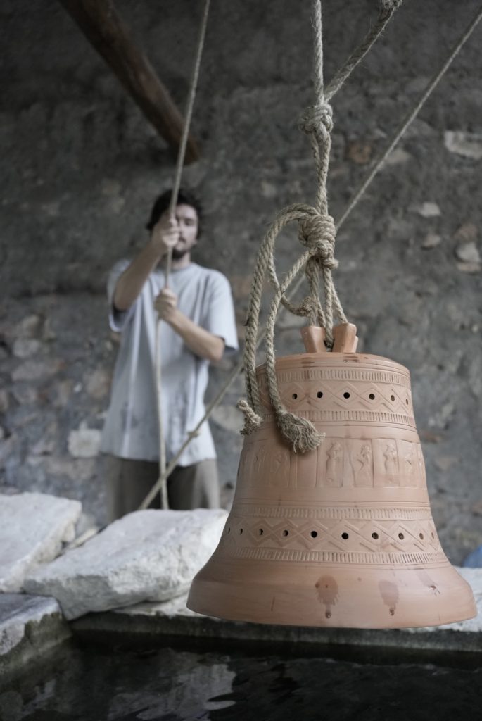 Como búsqueda explorativa en una residencia artística en la provincia de Roma, Italia, fui con la premisa de intentar cruces entre el patrimonio sonoro de esa región y el patrimonio sonoro andino, eje de mi trabajo investigativo de los últimos años. Luego de una experiencia onírica con las campanas de la localidad de Licenza, esta obra se tornó en explorar la forma de la campana y todo su simbolismo, pero no como la clásica campana católica de bronce, percutida y bulliciosa, si no como una campana que ahora integraría una tecnología ritual que es andina, en la que es el agua la que le permite sonar, a través de la inmersión en ella.