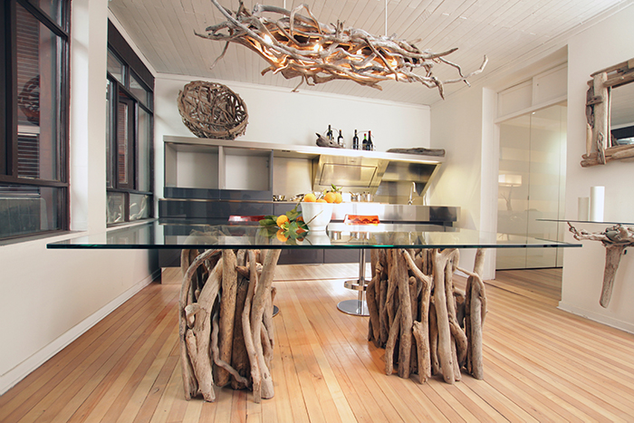 Nuestro material principal es la madera a la deriva, pero también utilizamos maderas antiguas, metales como fierro y acero, mármol, piedras, cueros y cristales.