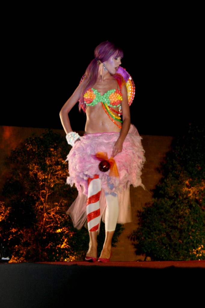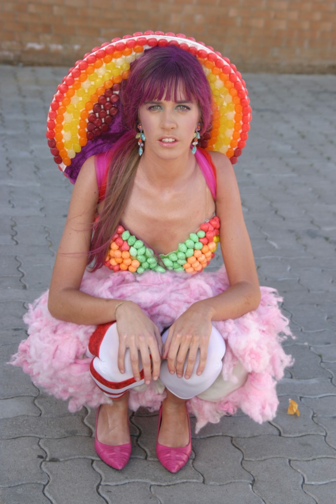 Los alimentos son imprescindibles en la vida del ser humano, y en general es una de las cosas que a menudo tientan al hombre, en especial los dulces, es por esto que elegí trabajar con ellos, sus sabores y formas frutales y sus miles de colores me permitieron realizar un traje muy alegre y colorido con una estética kitsch.