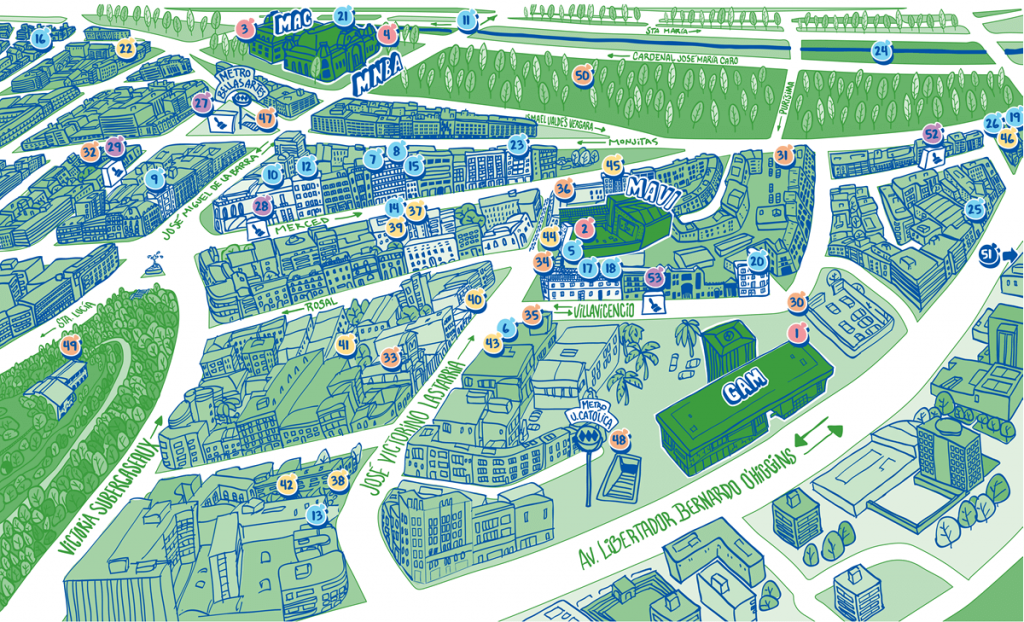GAM y MAVI, además de las galerías Plop Galería, Ekho Gallery, Galería Ulises Lastarria, Espacio O + Casa O, Galería Cima, Galería Flach y Galería de Arte Posada del Corregidor, junto al Teatro Ictus, Centro de Arte Alameda, Galería Lira, Teatro del Puente y Anfiteatro Bellas Artes, se mantendrán abiertos hasta la medianoche con su programación cultural. Además, los visitantes podrán disfrutar de exposiciones simultáneas tanto en tiendas del circuito, entre las que destacan: Colmado Coffee & Bar, Librería Metales Pesados, La Tienda Nacional, Leerté, Libros Psiquis, Librería del GAM, Libro Prólogo, Librería Ulises Lastarria, El Cid Campeador y Qué Leo Forestal.