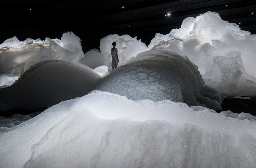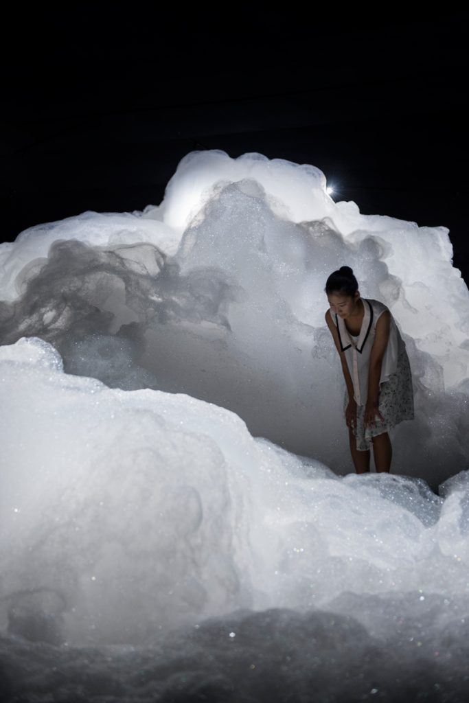 Nawa llenó una habitación oscura de ondulantes nubes de espuma utilizando una mezcla de detergente, glicerina y agua; creó las formas burbujeantes de su exposición.