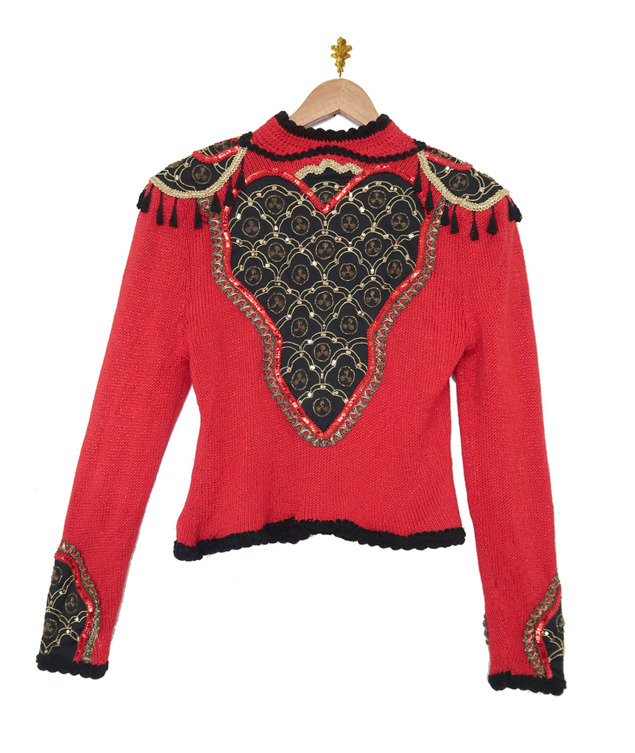 Chaleco rojo aplicaciones en colores doradas y negras, en el cuello, hombros y espalda, bello trabajo de pasamaneria y mostacillas, cuello mao