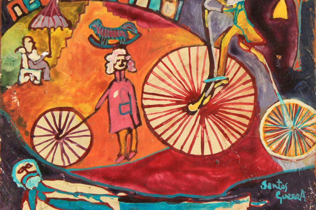Santos Guerra hasta entonces no había pintado murales. Pero sin duda encontró su oficio. Con extrema habilidad plasmó su imaginación, su mundo onírico, ingenuo, en el que habitaban hadas, gatos, flores y figuras circenses, además de versiones interpretadas por él de las personas que se encontraba en estos bares de buena muerte.