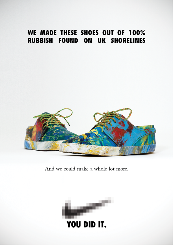 Para alertar sobre esta problemática, Charles Duffy, William Gubbins y Billy Turvey crearon Everything you buy is rubbish(todo lo que comprás es basura). Recorrieron las costas oeste y sur de Inglaterra y de la orilla del río Támesis, recogieron algunos de los desechos que se encuentran diseminados a lo largo de ellas, y crearon el primer par de zapatillas hecho 100% a partir de basura.